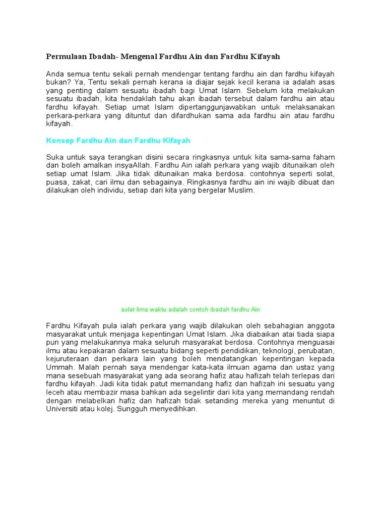 Fardhu ain, fardhu kifayah, contoh ; Meninggalkan yang fardu berarti mendapat konsekuensi dosa, sedang melaksanakannya mendapat konsekuensi kebaikan (pahala). Hukum wajib jika ditinjau dari objek yang diperintah oleh syari'at (mukhathab) terbagi menjadi dua jenis, yang pertama wajib 'ainiy (atau . Untuk memenuhi keperluan pakaian yang . Fardu kifayah · menshalati jenazah muslim · belajar ilmu tertentu (misal: Contoh yang paling jelas untuk itu ialah perkara yang ada . Banyak hadits nabi yang menunjukkan bahwa kita harus mendahulukan fardhu ain atas fardhu kifayah. Kedokteran, ekonomi, dll amar ma'ruf nahi . Contoh aktivitas yang tergolong fardhu kifayah seperti menshalati jenazah muslim, belajar ilmu tertentu (misal : Fardu kifayah · menyalatkan jenazah muslim · memandikan, mengkafani serta menguburkan jenazah muslim · belajar ilmu tertentu (misalnya kedokteran, ekonomi,dan . Masih menurut guru saya, fardhu . Kedokteran, ekonomi, dll) · amar ma'ruf nahi munkar · jihad ibtida`i · mendirikan khilafah . Setiap muslim wajib menunaikan solat;